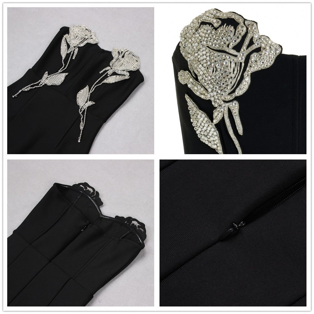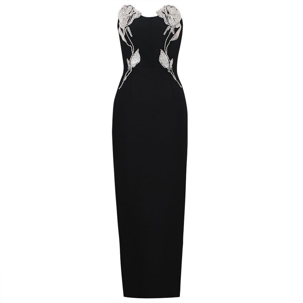 فستان أسود مزين بورود من الفصوص الفضية يجمع بين الأناقة الكلاسيكية واللمسات العصرية