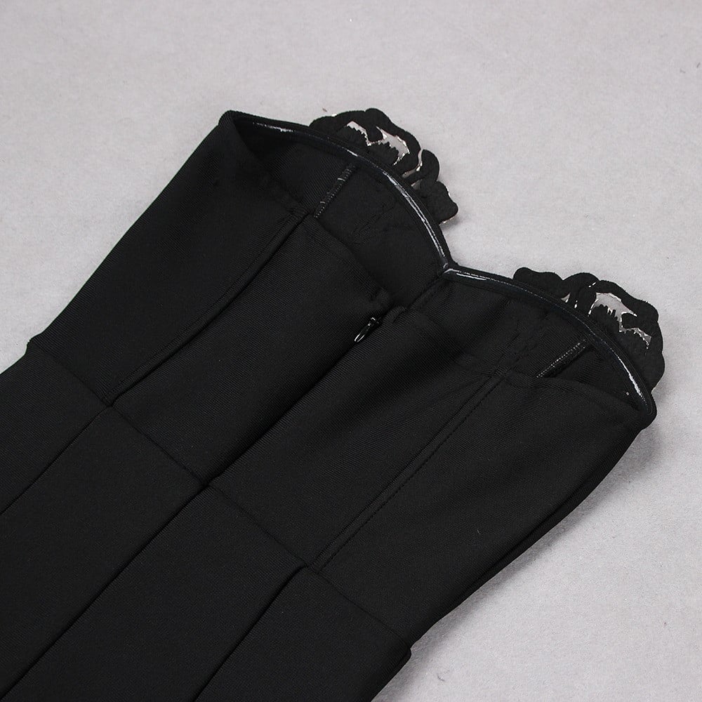 فستان أسود بفتحة ساق وتفاصيل مرصعة بالفضي يعكس مظهرًا مثيرًا وراقيًا