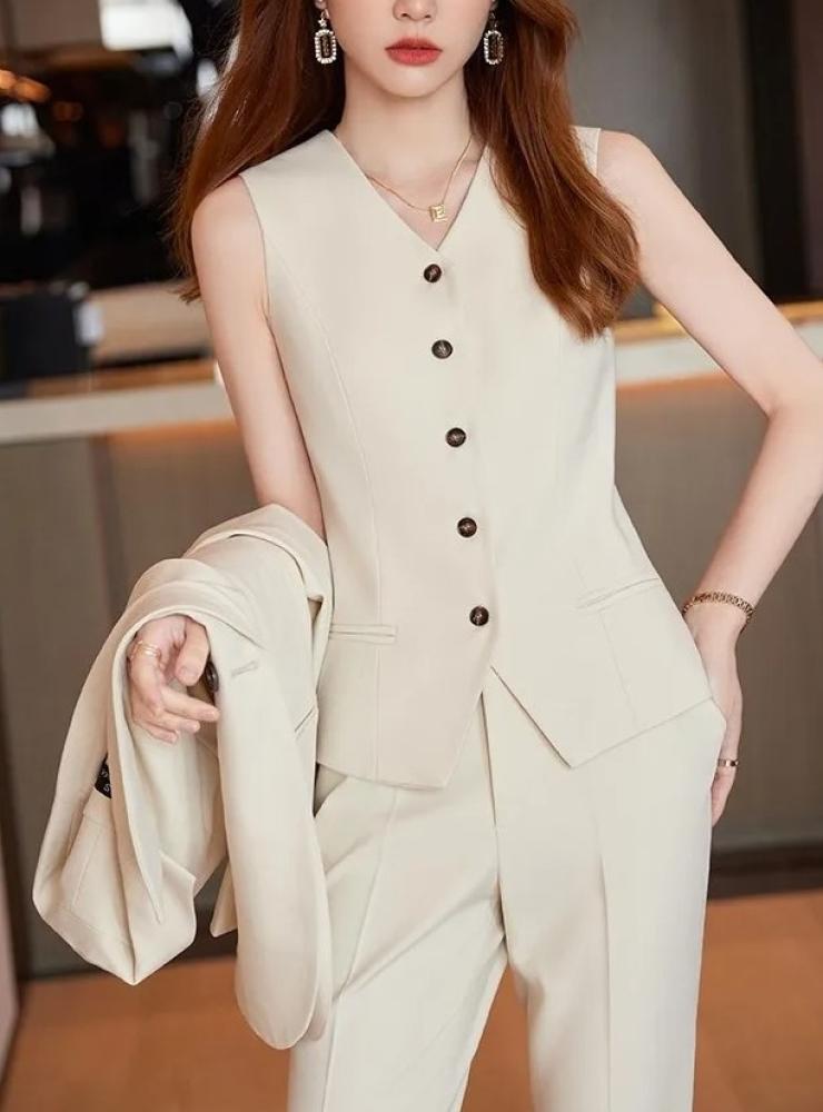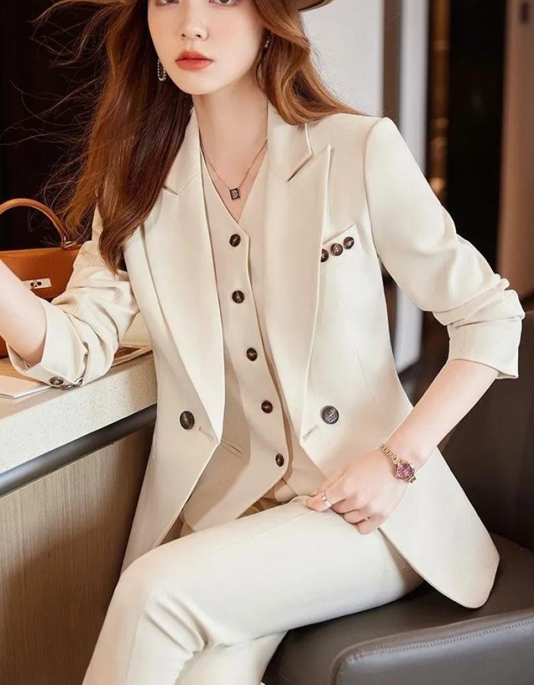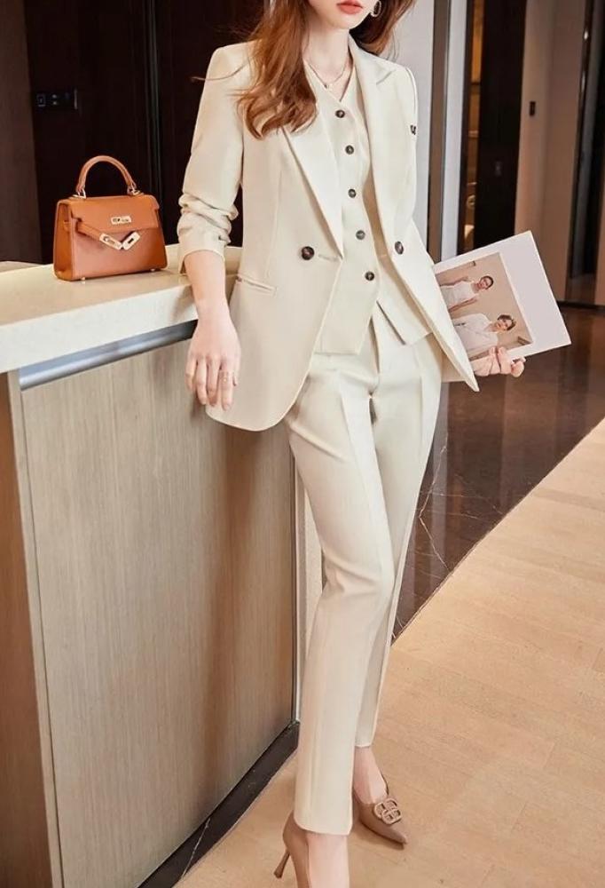 بدلة نسائية فاخرة باللون البيج الفاتح من فيري نايس، مكونة من 3 قطع بتصميم عصري وأنيق، تشمل جاكيت بأزرار مزدوجة وسترة كلاسيكية مع بنطلون ضيق بقصّة أنيقة. هذه البدلة مثالية للمناسبات الرسمية والاجتماعات العملية، تجمع بين الأناقة الأنثوية والتصميم العصري لتناسب المرأة العصرية التي تبحث عن إطلالة راقية ومتألقة. لون البيج الفاتح يعزز من جاذبية الإطلالة، مما يجعلها خيارًا مثاليًا للسهرات والمناسبات الخاصة.