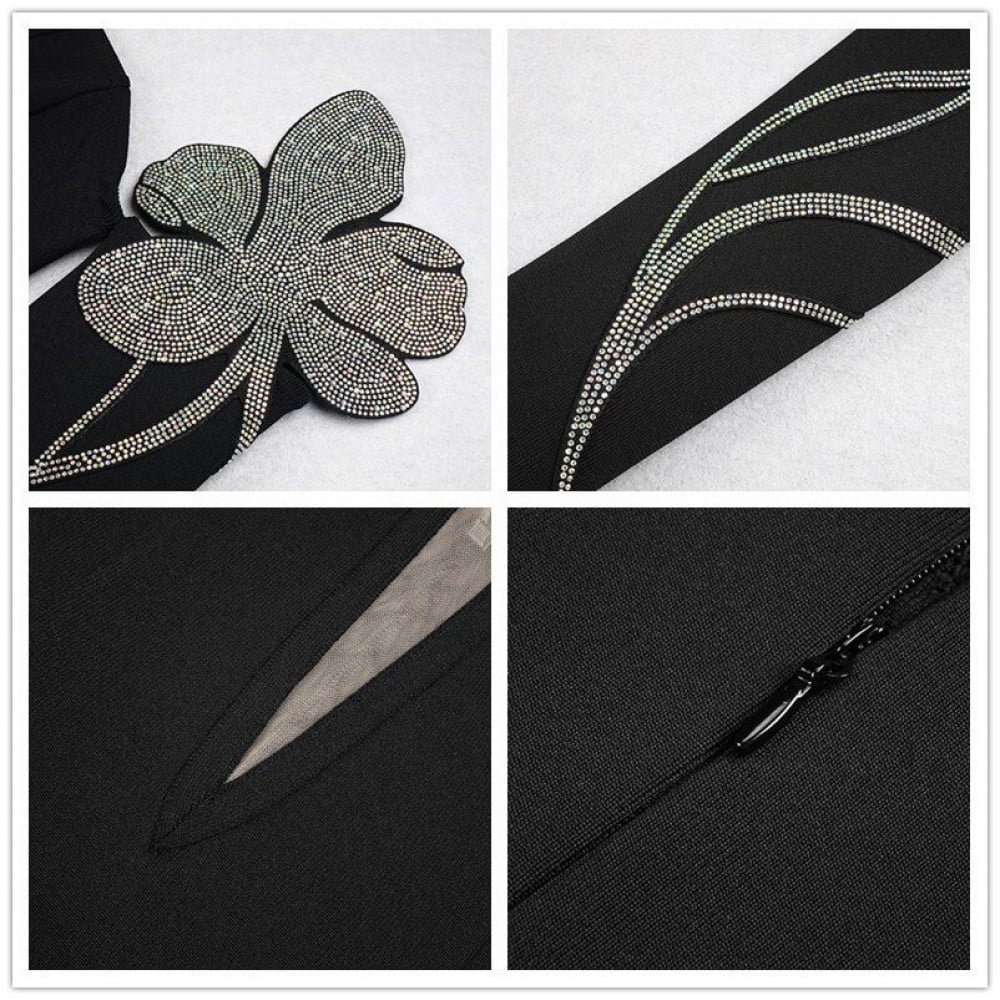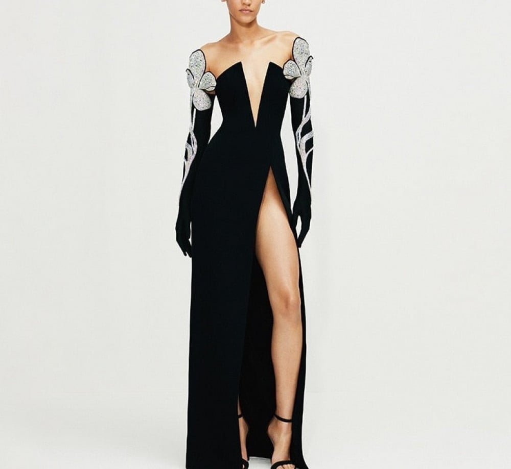 فستان أسود طويل مكشوف الساق ومزين بتفاصيل وردة من الفصوص